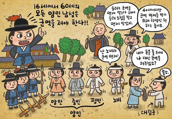 조선의 군사 조직은 양인들로 이루어졌으며, 개병과 농병이 일치하는 의무병으로 이루어졌다.