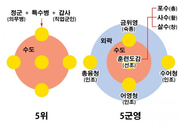 중앙군은 5위로, 지방군은 영진군으로 관리하였으며, 후기에는 5군영과 속오군으로 변화한다.