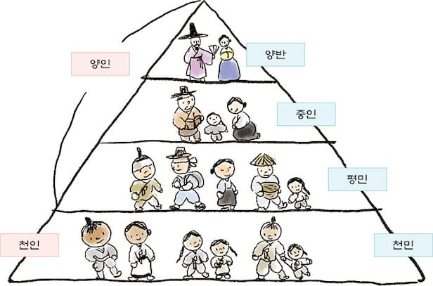 양반(문신+무신) > 중인(하급 관리, 서얼) > 상민(봉수군, 수군과 같은 신량역천(신분은 양민이나 일은 천민만큼 고되다)이 나타남) > 천민(대다수는 노비였으며, 백정도 있었음)