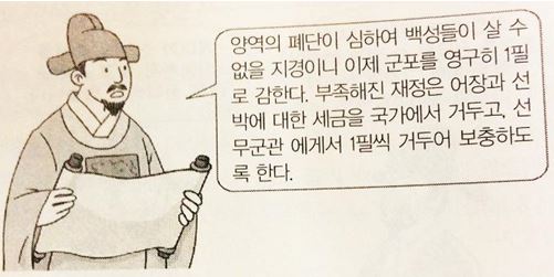 군역의 형태로 수취하였지만 대립과 방군수포(1년 2필으로 면제해주는 것)로 인해 요역의 형태를 갖추게 되었다. 임진왜란 이후 영조가 1년 1필을 수취하는 균역법을 실시하였으며, 부족한 세금은 어·염·선박세, 선무군관포, 결작(1결 2두)으로 충족하였다.