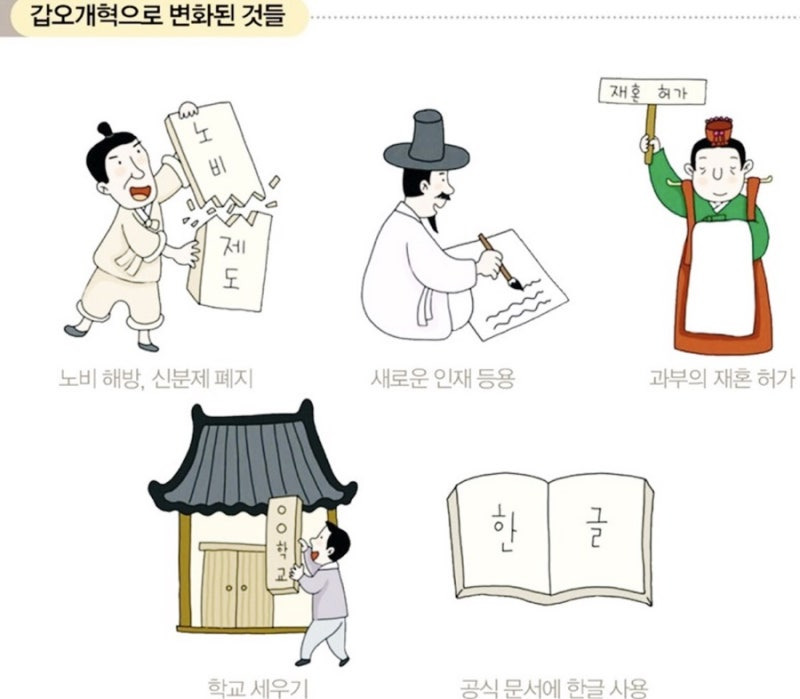- 사회: 신분제 폐지, 과부 재가 허용, 과거제 폐지