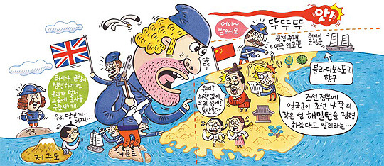 - 영국: 거문도 불법 점령 이후 중립을 주장하는 유길준(<서유견문>으로 유명)과 독일인 부들러가 등장하였다.