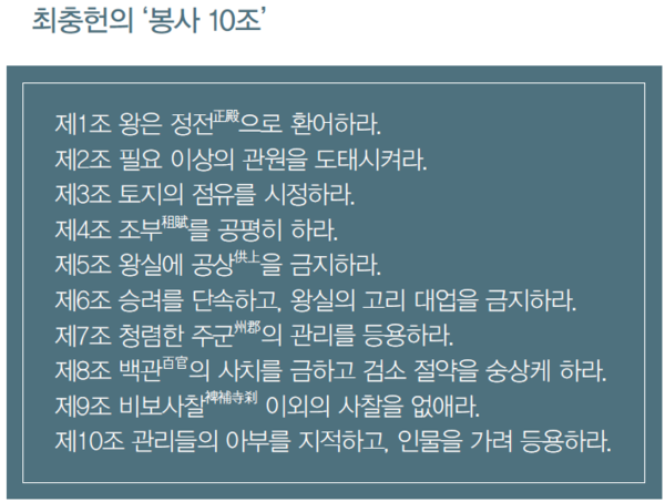 이후 지배 세력은 이의방 → 정중부 → 경대승 → 이의민 → 최충헌 → 최우 순으로 변화하였는데, 최충헌은 봉사 10조라는 개혁안을 왕에게 올리기도 하였으며, 최우는 강화도로 천도하였다.