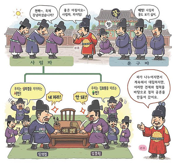 선조 때 사림파의 세력이 동인(김효원)과 서인(심의겸)으로 나뉘게 되며 붕당 정치가 시작된다.
